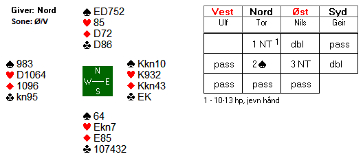 Det ble ikke enkelt å få utvekslet informasjon etter dette. Kanskje litt forsiktig av Nils å passe, men samtidig kan det godt tenkes at 4 spar er høyeste kontrakt som står. Det er jo ikke så mye som tyder på at det er noe særlig tilpasning i spillet. Tor spilte ut sin single ruter. Uansett utspill var det med den aktuelle sitsen tolv enkle stikk for spillefører. Alt forsvaret fikk var et trumfstikk.