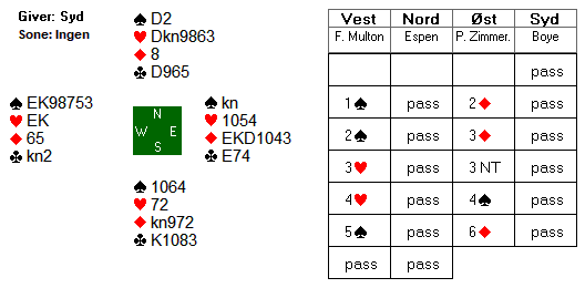 Noen spill senere var det godt spill for slem øst-vest. Tor Helness gjorde imidlertid livet surt for Ulf og Nils da han hoppet inn med 3 hjerter over Ulfs sterke kløveråpning: