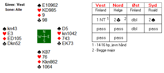 Det er meg ikke kjent hva alle meldingene betyr, men øst krevde til utgang med 2 ruter og fikk vist minst 6-korts ruter med 3 ruter. Med ess-konge i begge majorfargene er det ingen tvil om at han har meget gode kort.