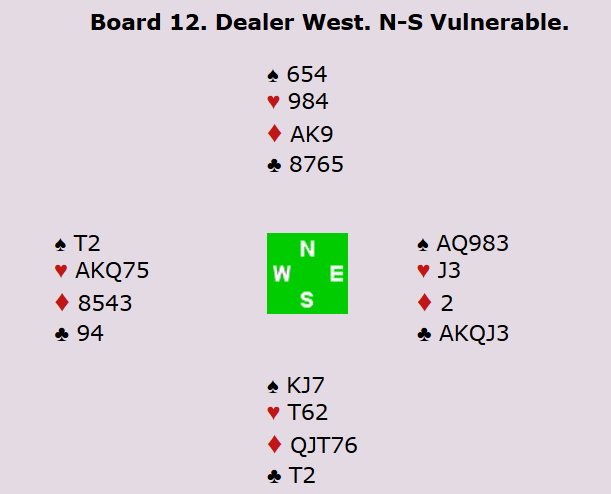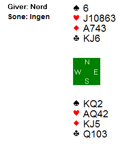 Her var det om å gjøre å unngå 3 grand. Nord-syd kan hente fem ruterstikk. Utspillet er opplagt fra syd, og absolutt mulig å finne for nord også. 4 hjerter og 5 kløver er de tryggeste utgangene. Mens 3 grand står på ruteren 4-4, er det godt spill for lilleslem i kløver eller hjerter på 5-2-tilpasning. Om sparfinessen går, er man hjemme så lenge ikke hjerteren og/eller kløveren sitter verre enn 4-2.