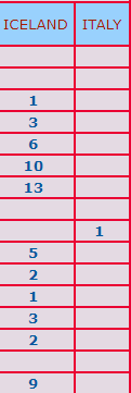 Island ligger i øyeblikket godt an på 3.plass og blir garantert å regne med mot slutten av mesterskapet. Det så lenge ut til at Italia ikke skulle komme på papiret i det hele tatt, men det ble med ett enkelt overstikk-IMP midtveis. Baldur (Jon Baldurrson) og makkeren hadde kanonliste i åpent rom, og det hadde også Island ved det andre bordet. Sluttresultatet ble hele 55-1 til Island, et veldig uvanlig resultat for de seiersvante italienerne.