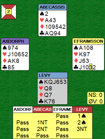 Abecassis for Frankrike sa 2 grand som absolutt er fristende selv om jeg tror jeg selv ville gjort det samme som de fleste gjorde i samme meldesituasjon, de passet. Nilsland for Sverige passet på 2 spar, og det er antagelig minst like ofte riktig. Slik så hele spillet ut: