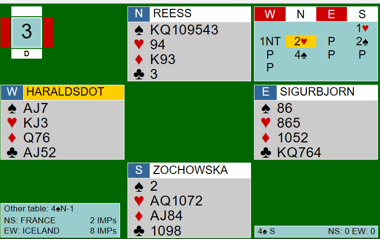 Siden sparfargen satt behagelig 3-3 var det enkelt å vinne 3 grand, og det ble til og med ett overstikk, Frankrike + 630. Sverige noterte kun +170 i 2 spar - 10 IMP til Frankrike.