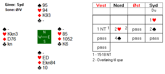 Boye lot ruteren gå til esset i bordet og dro hjerter knekt. Øst dekket med kongen (i tilfelle makkeren skulle ha singel dame...) og syd stakk med esset og spilte ny hjerter til 10'eren, der vest kastet en kløver og øst fulgte med den siste trumfen.
