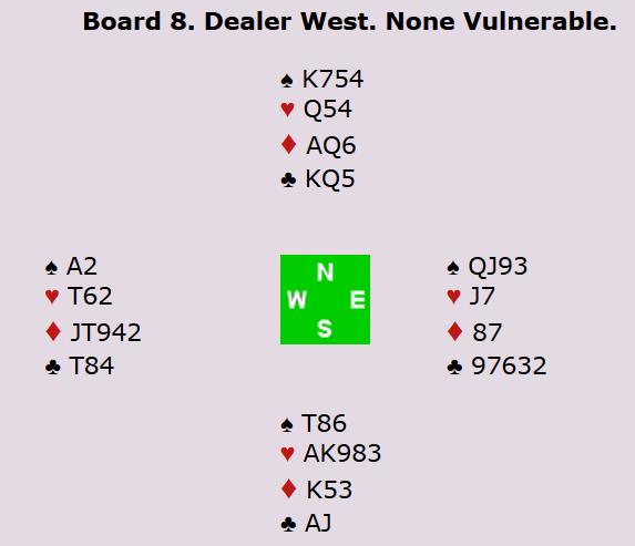 Spill 8 svingte ikke mer enn ett IMP i åpen klasse da begge lagene stoppet i utgang - Norge i grand og Kroatia i hjerter. Men dette spillet svingte i en del av de andre kampene. Hjerterslemmen er ikke spesielt god, men med hjerteren 3-2 og spar konge foran (litt over 30 % sjanse), sto det tolv stikk.