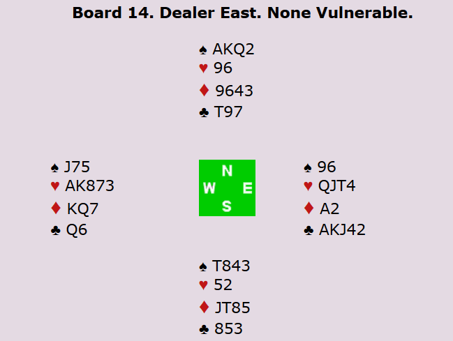 Her fant kroatene den gode hjerterslemmen øst-vest, mens Ulf og Nils stoppet i utgang for Norge. Man kan se for seg at det ikke er så enkelt å melde etter at syd åpner og vest går inn med 1 spar. Det er vanlig å spille 2 hjerter som konstruktivt (men ikke krav) fra øst i denne posisjonen. I så fall må øst overmelde motpartens farge (som i første omgang tyder på god løft i spar). Vest melder 2 spar, før øst kommer igjen med 3 hjerter, som er krav. Vest har ikke så mye annet å melde enn 4 hjerter. Men dette er ei melding som må avgis på en del ulike hender. Han trenger hverken ha 3-korts hjerterstøtte eller stjeleverdi i ruter. Så det er ikke unaturlig at øst passer ned. 13 IMP ble det til Kroatia i alle fall.