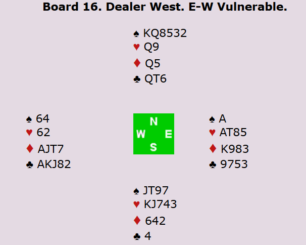 Nå spilte hun hjerter til esset på hånda, og fortsatte med ruter knekt. Vest dekket med dama, og kongen vant stikket. Etter å ha tatt en trumfrunde til, spilte hun ruter 9 fra bordet. Aktuelt dekket øst med tieren, før spillefører stakk med esset. Hun tok for ruter 8 og kunne til slutt sake bordets hjertertaper på det siste ruterstikket.