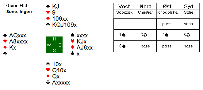 Jeg startet med 3 hjerterstikk og skiftet liten kløver til Sofies ess, som siden måtte få 2 ruterstikk til for +500 og en ren topp!