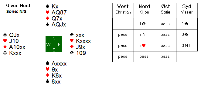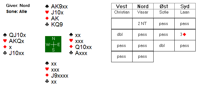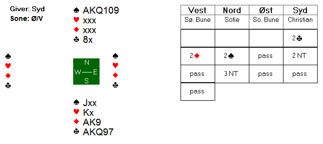 Etter at vest meldte inn 2 ruter i ugunstig sone, viste 2 spar fra Sofie en positiv hånd med 5 spar og 2NT fra meg 20-21 balanserte. Jeg valgte å passe 3NT med 3-korts spar, siden jeg trodde det kunne være like mange stikk i NT med min kløverfarge og dobbelhold i ruter.
