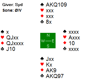 Rene åpnet i 3. hånd med sterke 2 kløver og Knut svarte 2 grand som lovte 7-9 poeng uten 5- korts farge. Da Rene gjenmeldte 3 kløver viste Knut med 3 hjerter 4- kort der. Eriksen gjenmeldte da 4 kløver som fastsatte trumfen og Molander viste med 4 spar styrke der. Det var nok for hopp til 6 kløver fra Syd. De andre bordene kom i 3 grand og 4 hjerter.