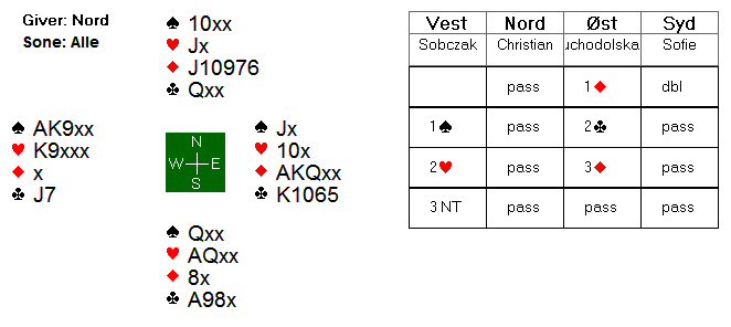 Nederlenderne meldte seg ganske naturlig opp til 3nt, og Sofie spilte ut ruter 9!