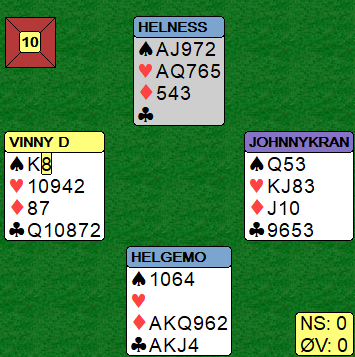USA spilte som N/S 6 ruter som var enelt å vinne. Tor og Geir meldte imidlertid storeslem i ruter, og den kunne ikke vinnes etter spar 8 (!) ut fra vest. Spillet kostet hele 16 IMP.