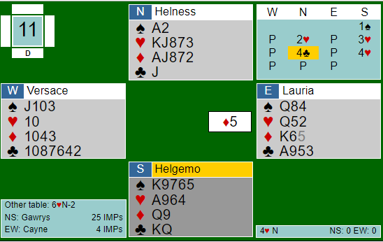 Helness fikk ruter ut mot 4 hjerter og vant det stikket - en favør. Han tok to store hjerter fulgt av tre runder spar, den tredje trumfet hos nord. Siden fargen satt 3-3 kunne han få kastet kløver knekt på godspilt spar og endte opp med tolv stikk, det ble kun en trumftaper. Ved det andre bordet spilte Zimmermann ut kløver ess mot 6 hjerter, og da ble det to bet og 13 IMP til "vårt" lag.