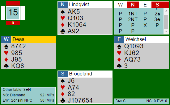 Brogelands 2 spar var overføring til minor, og idet han sa 3 kløver ba han om å få spille den kontrakten. Weichsel på østs plass følte seg kanskje litt robbet og kom tilbake med en opplysende dobling i siste hånd. Da vest gjorde om doblingen til straff var Ø/V i trøbbel. Det kom spar ut, og da kløveren ble spilt riktig og motspillet kanskje heller ikke var så skarpt endte det med ni ganske enkle stikk, +670! Siden N/S hadde spilt 3 kløver udoblet ved det andre bordet ga dette 11 IMP til "Norge".