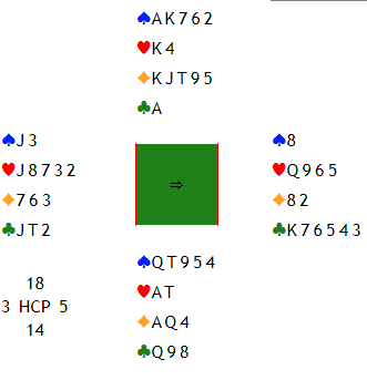 Da kunne nord avsluttet med 7 grand, for i så fall kan han telle fem sparstikk, to i hjerter, fem i ruter og kløver ess. Da ender man i den sikreste kontrakten, og hvis det er parturnering vil man også få veldig nært oppunder topp!