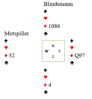 Det har altså gått to runder ruter, ruterstjeling hos øst, tre runder trumf etterfulgt av det spektakulære sparstikket. I andre sparrunde spar til tieren. Og da er altså sparen blokkert med åtteren singel, for hvis den stikkes over med nieren har nord stopper igjen. Men inne på vest sin hånd på spar 10 spilles de resterende trumfene. Før den siste ser det slik ut: