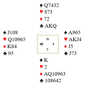 Artig sluttposisjon, men spillet var jo allerede ødelagt for N/S. Sånn kan det går når motspills-regler man her lært seg følges for slavisk og det ikke brukes logikk i motspill.