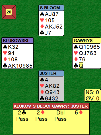 Ved det andre bordet satt Steve Bloom nord og ble spillefører i 5 ruter. Han var motspilleren som var så hjelpsom med å løse kløveren for +590 til Zimmermanns Ø/V i et senere spill, men i dette spillet var han god. Han hadde riktignok litt bedre peiling på fordelingen etter at vest hadde vist lang kløver med 2 kløveråpning (Presisjon), og øst hadde doblet nords innmelding 2 ruter for å vise majorfargene.