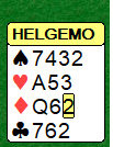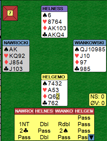 Vest åpnet med 1 grand mot Helness-Helgemo, nord doblet (sterkt), og øst sa redobler som i deres system er måten å "rømme" til en farge. Makkeren sa (obligatorisk) 2 kløver, og øst sa 2 spar. Over dette kom Helness tilbake med en opplysende dobling, han hadde jo perfekt fordeling for det. Hva ville du meldt med Helgemo sine kort? Helgemo passet, en litt tøff avgjørelse vil mange si, men det så ikke særlig fristende ut å spille egen kontrakt på tre-trinnet i sonen heller, normalt med kun 4-3 tilpasning. Dessuten har jo nord vist kjempekort etter dette. Slik så hele spillet ut:
