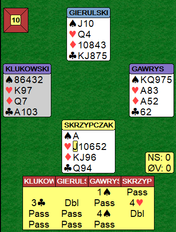 Men Skrzypczak skiftet til kløver! Kanskje var det makkerens ruter 3 i ruterstikket som lurte han til å gjøre det? (polakkene spiller med mye Lavithal-betydning i signalene)?