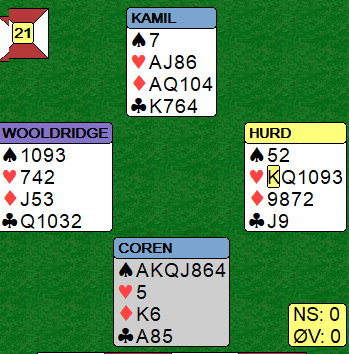 Her er meldesekvensen som Kamil-Coren hadde. Det er litt uklart hva de forskjellige meldingene betyr, men gjetter på at etter syd krevde til utgang med 3 hjerter (motpartens farge) og så gjentok sparen, var hans 4 hjerter kortfarge. Så kom Key-Card Blackwood, og 5 grand storeslemsinvitt hvor det vises spesifikk konge, her kløver konge. Så antas at 6 ruter var spørsmål om tredjekontroll som nord bekreftet at han hadde (damen), og de var fremme på riktig nivå - syv-trinnet!