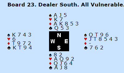 I semifinalen lå ZIMMERMANN under mot SPECTOR hele veien, men i siste sett dundret våre gutter på og tok igjen de 23 IMPene de lå under før de siste 14 spillene. Så kom et par utganger og andre gode spill i ZIMMERMANNS favør, og de var plutselig i ledelsen med få spill igjen. Et avgjørende spill var dette: