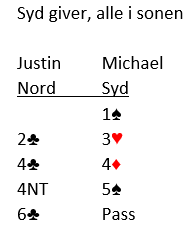 Etter en veldig lang tenkepause kom 4 kløver fra syd, og de kom seg etter hvert opp i 6 kløver. Med uavgjort spill ble det seier til lag GUMBY i turneringen.