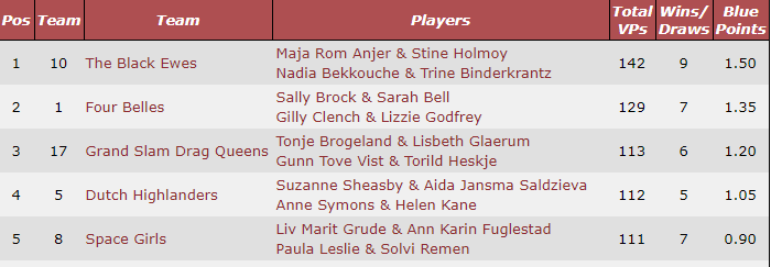 Som nevnt i tidligere innlegg ble det norsk/dansk seier i Young Chelsea BC sin dameturnering ved Maja Rom Anjer, Stine Holmøy, Tine Binderkrantz og Nadia Bekkouche. Triumfen ble fulgt godt opp av norske spillere både på 3. og 5.plass. Her er topp 5 på listen i det 20 lag store feltet: