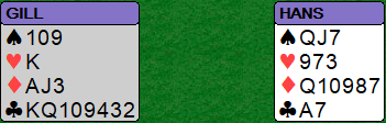 Men han fikk det som han ville. Da spar konge vant første stikk skiftet han til hjerter, og N/S tok seks hjerterstikk samt også spar ess for fire doblede bet, +1100 til N/S.