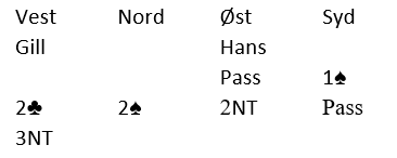 Gill lot det stå til, og syd skulle finne et utspill. Ber nord om spar ut nå, eller ber han om et annet utspill enn fargen de har meldt og støttet? Syd satt med dette: