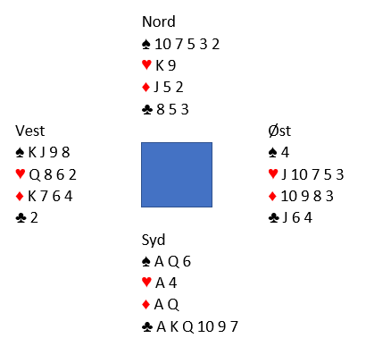 Hun så etter det litt sære sparutspillet for seg en svindelvariant kombinert med kanskje en skvis hvis utspilleren også hadde ruter konge. Etter en kløverrunde spilte hun ruter dame! Den burde nok vest ha stukket, men da han kanskje hadde et fåfengt håp om at makkeren kunne komme inn la han liten. Så ruter dame vant stikket og tolv stikk var sikre uten at forsvaret hadde fått noen stikk så langt. Marianne kjørte i gang med kløverstikkene. Etter de var brukt opp tok hun for ruter ess og hjerter ess, og dette var igjen: