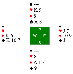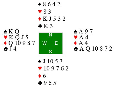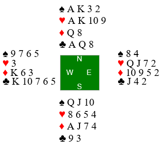 Nord hadde firekorts hjerter, men det var nå en god score allerede for det danske paret fordi de hadde unngått kontrakten 4 hjerter som var ganske populær rundt omkring i lokalet. Der er det to hjertertapere og en rutertaper, ti stikk.