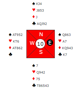 Toppen N/S gikk til et par som fikk en gavepakke da Ø/V spilte 5 hjerter! Den kontrakten gikk seks bet, og +500 var den eneste scoren på N/S. Hvordan meldingsforløpet gikk til 5 hjerter? Det vet jeg ikke, men kanskje er det min skyld? En mulighet er at det Ø/V-paret som havnet i 5 hjerter på 3-2 tilpasning hadde "forlest seg" på min artikkel forleden om "spørsmål om trumfdamen" i forbindelse med Blackwood? Eller, kanskje ikke... Like sannsynlig er det at det var øst som spurte om esser, og da vest sa "to ess" (eller Key Cards) tenkte øst vi må stoppe, og så glemte han å korrigere til 5 spar og passet! Det er en sånn feil vi faktisk har sett mange ganger, man bestemmer seg for å bremse og passer på Blackwoodsvaret. Da er det nesten så man har lyst å gi det tilbake til han som var uheldlg, det er jo bare en tulleglipp som ikke har noe med bridge å gjøre. Men samtidig er det jo slik at det handler om å være konsentrert også, og er man ikke det får man ta det dårlige spillet?