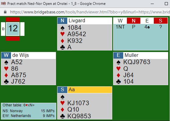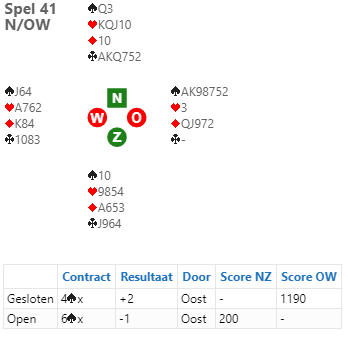 Det er faktisk en bra 6 spar, kun ruterstjeling beter den siden sparen sitter 2-1. I 4 spar doblet ble det to overstikk da ruterstjelingen ikke ble funnet, +1190 til Nederland!