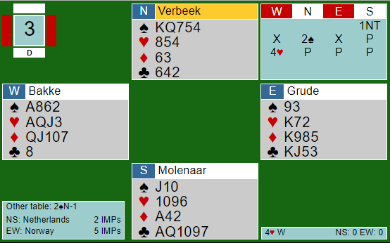 Han fikk spar konge ut fra nord, syd la knekten og vest lasjerte. Nå blir det problemer om nord skifter til kløver, men hvordan skal han kunne vite at det er riktig? Verbeek spilte ruter i andre stikk. Syd la liten, og vest vant stikket for tieren. Da fulgte spar ess og spar til stjeling med kongen. Så tre runder trumf fulgt av ruter dame. Syd stakk og fridde seg med ruter som Christian vant med knekten slik at han bevarte den siste store ruteren hos øst. Da var det tid for innspill, og kløver til knekten ble stukket av syd sin dame. Men han var da innspilt og måtte spille kløver tilbake, den eneste fargen han på det tidspunket hadde! Ekstrastikket i kløver på samme måte som det kan skje i 3 grand, men med den forskjell at nordmannen hadde fått ett ekstra stikk i hjerter ved å stjele en spar hos øst. Syd spilte kløver ess tilbake. Vest kunne stjele og hadde inntak til øst på ruter konge til å kunne hente det tiende stikket for kløver konge. +620!