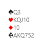 Du kan ikke passe da det er grunn til å føle seg litt robbet. Makker som måtte ta stilling til dette så høyt kan godt ha bra kort. Mer sannsynlig at vi har en vinnende kontrakt på femtrinnet er det at vi har en stamp mot 4 spar, men det behøver jo ikke være i kløver. Likevel, du kan nok ikke trygt gjøre noe annet enn å si 5 kløver her. Hvis du dobler har du en liten "oppside", makker kan passe og det viser seg å være at dette er hvor vi skal spille hvis det er en bet, eller to i 4 spar, og vi ikke har noen vinnende kontrakt. Men det er alt for farlig å doble. Sannsynligheten for at makker sier 5 ruter er stor, og da må du nesten si 5 hjerter. Har han ikke hjertertilpasning kommer vi for høyt!
