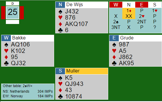 Åpningen 1 ruter var Presisjon (lover ikke ruter) Nords redobling i andre melderunde viste trekorts hjerter. Grude sin 2 hjerter - krav - fulgt av 2 grand antyder antagelig at han ikke er helt sikker på hva som er riktig utgang (han ha kun en hjerterstopper). Jeg forstår ikke helt hvordan De Wijs kan finne på å doble vests 3 grand-melding etter å ha åpnet meldingene med 10 hp, og han tror vel ikke ruteren er gående egentlig? Muller sin utspilte hjerter dame var ingen trussel for Grude, men ruteren var skrøpelig. Idet Tor Eivind spilte spar 9 i andre stikk dekkete Muller (korrekt motspill i teorien) var det enkelt, ingen rutertrussel, for nordmannen vant med esset og gikk hjem på hånden i kløver og tok hjerterfinesse med tieren. Hvis sparfinessen hadde tapt til nord og det kom liten ruter tilbake ville det blitt spennende for øst...Slik det gikk vant Grude enekelt 2+3+0+4=9 stikk, og kunne notere den hyggelige scoren +950.
