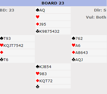Makker hadde ruterverdier, det var riktig...men resten av ressonnement mitt var ren tyttebærtur. Hvis det spilles ut kløver mot 5 hjerter - sikkert førstevalget for mange - stjeler makker, og vi kunne vi hentet tre doblede bet. Vi får i alle fall to bet selv om vi ikke får med oss alle tre sparstikkene. Med ruter ut var det tolv enkle stikk. Spillefører kastet en spar på ruter ess, tok ut trumfen og tok to kløverfinesser for tolv stikk og +850, en soleklar bunn for oss da ingen hadde funnet på det jeg fant på, ruterutspill mot 5 hjerter doblet. Å ta to doblede (bare) ville gitt 83% vår vei.