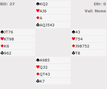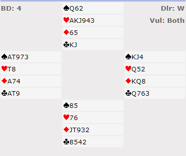 3 grand med ni stikk ville gitt litt under middels, 4 spar med ti ga 56%, og 3 grand med ti stikk ville gitt 75%. Det ekstra, ellevte stikket var som alltid verdifullt, +660 ga 100% score.