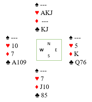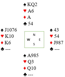 Det ble for fristende å spille en hjerter mot damen. Syd ville vel ha spilt ut sin makkers farge om han hadde en honnør? Som du ser gjør hjerter mot damen at det blir ti sikre stikk, og da er det nesten sikkert nært en topp, for mer enn ti stikk kan det neppe bli i sparutgang. Da hjerter 8 ble spilt fra vest i tredje stikk gjorde nord en feil, han la liten. Damen vant stikket, og det ville den jo gjort før eller siden selv om nord stikker opp. Men nå skulle det bli mer. Alle sparstikkene ble tatt, og deretter de to siste ruterstikkene. Idet de siste ruterstikket ble tatt så det slik ut:
