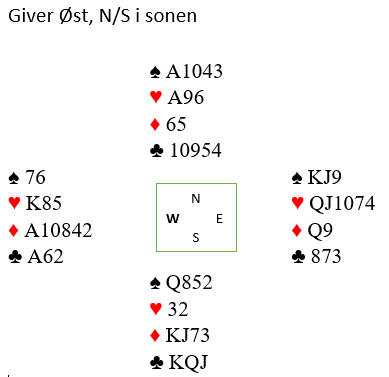 N/S har en sparkontrakt, og Ø/V kan vel vinne et par hjerter. På listen over scorene på dette spillet fra 1. og 2.divisjon samlet var det noen få hjerterkontrakter, de fleste 3 hjerter med en bet, noen svært få scorer Ø/V for vunnede hjerterkontrakter, men ellers var det sparkontakter N/S over alt.