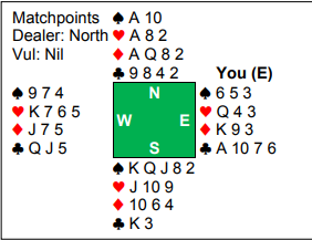 Han har vist 10 HP allerede, og om han har ruter knekt får vi kun ett stikk i ruter. Han må for at vi skal ha en sjanse ha tre små ruter, eller tieren tredje. Da kan vi få to stikk i den fargen, og beten. Og han vil i så fall få to rutertapere om vi ikke rører ruteren. Din makker kan jo nå bare fortsette med kløver, «no problem», ikke sant?