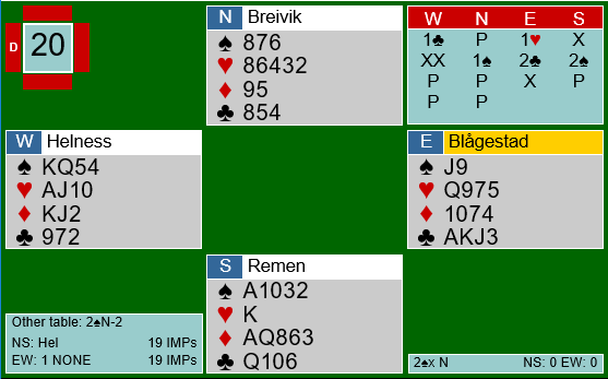 Ved det bordet vi ser meldingene fra ble det en brutal henrettelse gjort fra Blågestad-Helness sin side. Helness sin redobling viste kun trekorts hjerter. Da Blågestad i tredje melderunde hadde en god del ekstra for meldingene sine så langt doblet hun, ikke straff, men det viser verdier nok til at Helness passet ut 2 spar doblet. Motspillet startet veldig bra: kløver ess kom i utspill, svakhet fra vest, og øst skiftet til spar knekt. Spillefører lasjerte, og øst fortsatte med spar 9 som spillefører dekket med tieren og vest med damen. Nå kunne faktisk vest ha presset ut spar ess (gjenværende A-3) ved å spille spar konge og dermed dra med seg nord siste spar. I så fall kunne vest senere ha tatt ut syds siste spar (treeren) med sin egen femmer, men jeg tror de ville fått samme antall bet som da vest i stedet for å ta ut trumfen skiftet til hjerter ess og hjerter knekt som syd trumfet. Spillefører hadde ingen sjangs. Hun forsøkte liten ruter som vest vant med knekten og spilte trumf til esset mens øst kastet en kløver. Så ruter ess og mer ruter. Vest vant med kongen, og forsvaret tok resten med to hjerterstikk til, vest kunne kastet en kløver på den siste, og kløver konge og trumf konge til slutt (eller trumfkongen først som øst kaster kløver knekt på og øst har resten!). Dette blodbadet endte med fem doblede i sonen, +1400 til vinnerlaget! Spillet ga 15 deilige IMP på veien mot gullmedalje.