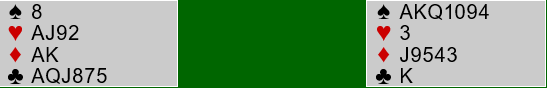Det er sannelig ikke langt i fra en storeslem det her. I 7 spar må trumfen ordne seg, dvs. sparen må sitte 3-3, knekten dobbel hvis det sitter 4-2, og en liten tilleggsjanse for knekten singel. Det er nok litt for dårlig sjanse for storeslem, men 6 spar er en glimrende slem.
