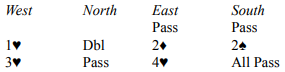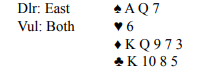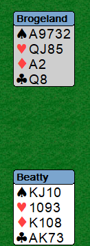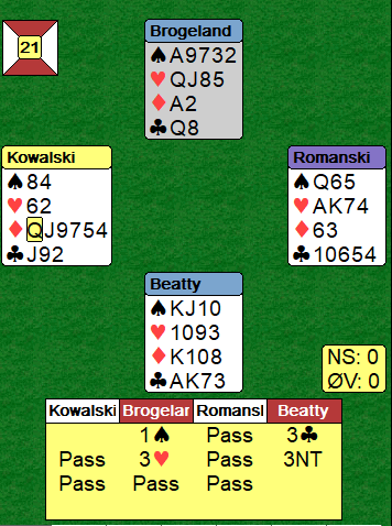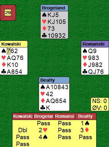 Beatty fikk trumf ut, og da slapp han å gjette den fargen i alle fall. Han spilte i andre stikk hjerter, vest la lavt og Beatty la….kongen. Da var det umulig å få nok stikk og utgangen gikk en bet, -100.