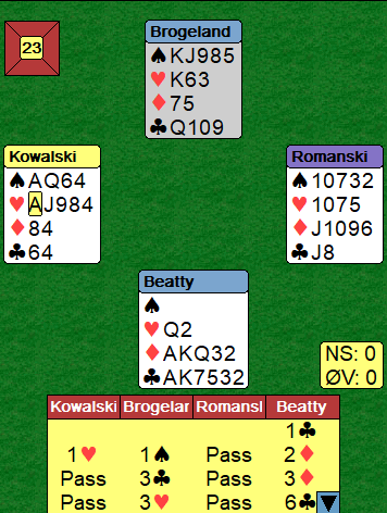 Et av de siste spillene kunne kanskje se litt skummelt ut da Brogeland-Beatty (det ble spilt en god del hurtigere ved deres bord) spilte 4 spar med tretten stikk. Med den snille sitsen var det alltid mulig å få tretten stikk, men det var ikke noen slem egentlig. Kunne polakkene ved det andre bordet likevel melde den knallharde slemmen med kun 29 HP til sammen og kun 5-3 tilpasning i spar?