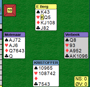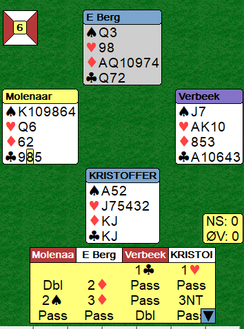 Kristoffersen var som du ser i 3 grand doblet. Doblingen var på et vis korrekt da kontrakten kan betes, men bare i teorien. For å bete må vest spille ut hjerter dame! Så hjerter til østs konge fulgt av sparskift. Da får motspillerne etablert fem stikk før spillefører har ni.