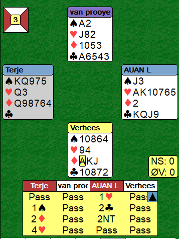 Ved det andre bordet i vår kamp startet det med 1 kløver av øst (Livgård) og 1 hjerter som viste spar fra vest (Aa). Legg merke til at de systemmessig viser majorfargen, og dermed ikke viser frem ruterfargen for motparten. Det skulle vise seg å være gullkanet. Livgård sa 2 kløver, og Aa avsluttet med 3 grand.