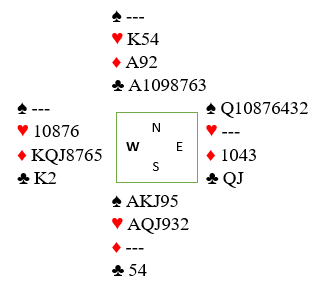 Ruter ess vant første stikk og en kløver forsvant fra syd. Så kløver ess og kløver til stjeling. Begge fulgte, og nords kløverfarge var godspilt. Om hjerter sitter 3-1 eller 2-2 er det tretten enkle stikk nå, og hjerter dame ble spilt. Hvis begge følger kan spillefører "claime" resten.
