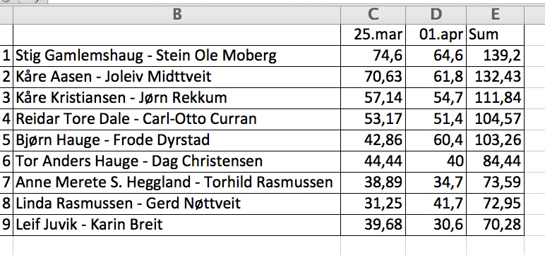 10 fulle bord hadde funnet veien til årets påsketurnering der var en god blanding med spillere fra alle nivåe.Jan Arild Olsen hadde tatt ansvaret for regnskapet og det gikk uten feil og Tor Birkeland hadde TL ansvaret og dette var helt kanon, så takk til dere for en godt gjennomført turnering. Det ble spillt 11 runder av 4 spill i runden med monrad og best ved kveldens turnering ble Stig Drangsholt og Markus Bruno på andre plass fulgte Jan Arild Olsen og Per Elvind Pedersen og tredje plassen gikk til Tor Birkeland og Liv Hilde Birkeland. Takk til alle som deltok ved turneringen og en riktig god påske til dere alle.